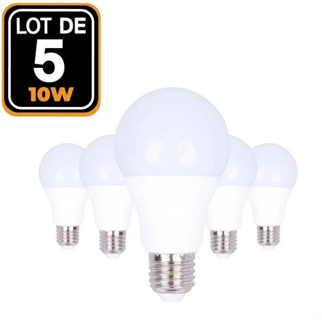 Lot de 5 Ampoules LED E27 10W Blanc NEUTRE 4500k fait partie d’une vaste gamme de lampes d’ambiance à LED, de longue durée, faible consommation , Solution économique et écologique, de nouvelle géneration, utilisation dans les maisons, bureaux, restaurants, hôtels et bâtiment publics.Elle remplace entièrement la lampe incandescence ou halogéne standard. Installation facile, longue durée de vie. Avantage: – Durée de vie : 25.000 heures – Consomme jusqu’à 85 % moins d’énergie – Ampoule LED omnidirectionnelle homogène et équilibrée – Allumage instantané Fiche technique du produit : Puissance : 10W Tension: 220v Fréquence: 50-60 Hz Luminosité: 800m Faisceau Lumineux: 270 Rendu des Couleurs (CRI): 80 Durée de Vie: 25.000 Heures Source Lumineuse: EPISTAR Dimensions: 60*110mm Matériel : thermoplastique Classe Énergétique: A+ Certificats TUV,CE & RoHS Garantie: 2 Ans