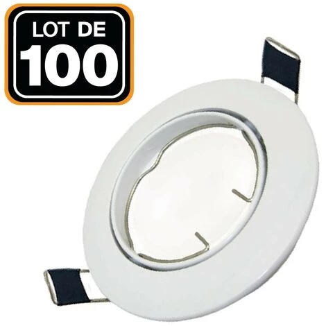 Lot de 100 supports encastrable blanc est idéale grâce à son centre orientable. Cela permet de diffuser la lumière dans une direction choisie. Son diamètre de 90 mm et le trou de coupe de 65 mm. L’ampoule se place par l’avant, très pratique lorsque l’on veut la changer.